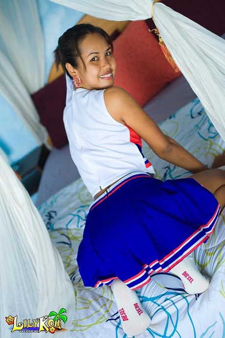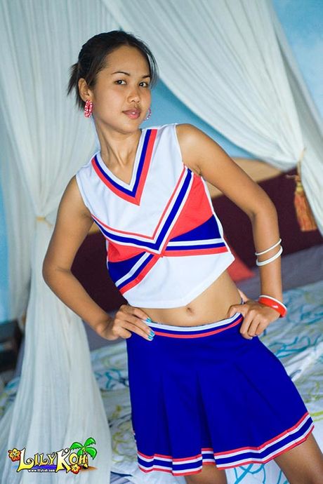 Lily Koh: Smiling Asian cheerleader flashes cute panties